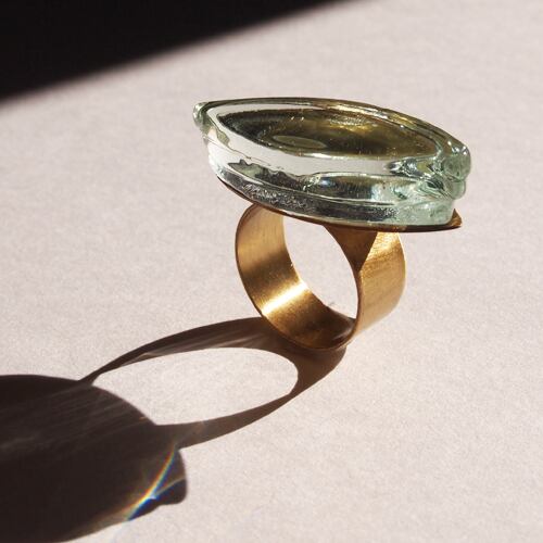 スペイン人ガラスアクセサリーデザイナーROSA MENDEZ((ローザ・メンデス)の"hielo"=氷シリーズのリング。窓ガラスをリサイクルして作ってユニークな作品。