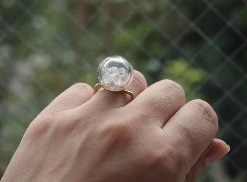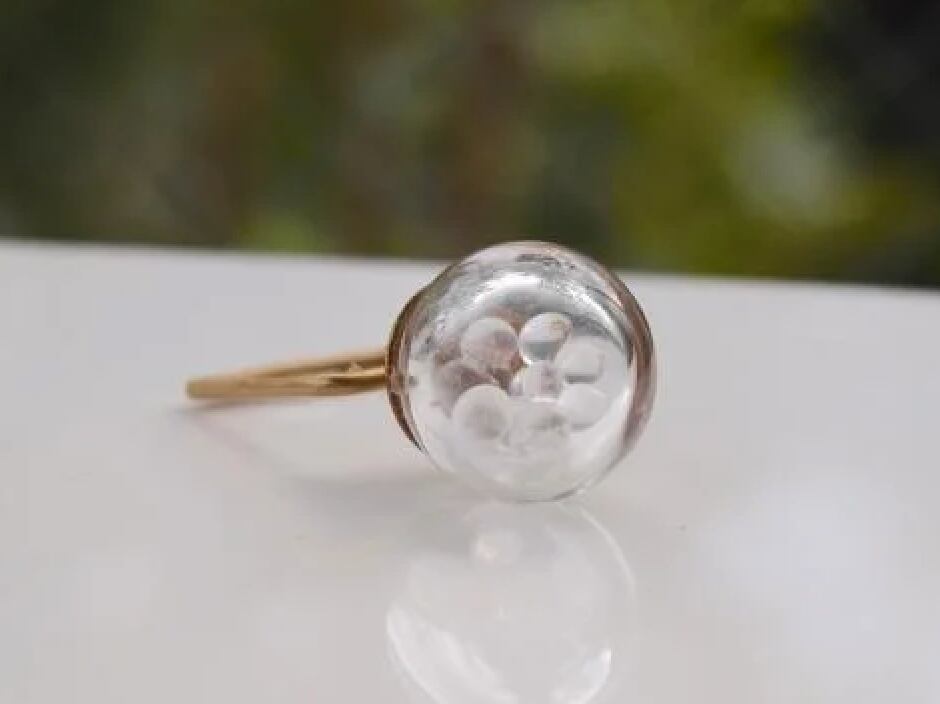 無色透明なガラスボールの中に小さなガラスのボールを閉じ込めた、なんともユニークなネックレスです。