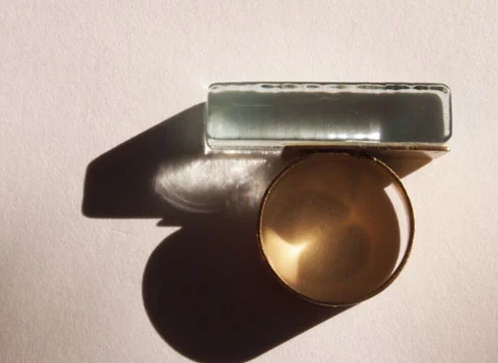 淡い淡いブルーグリーンカラーのガラスを長方形にカットし、アシンメトリーになるように使ったリング。