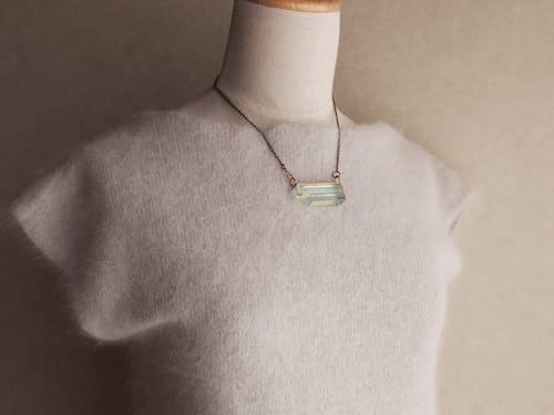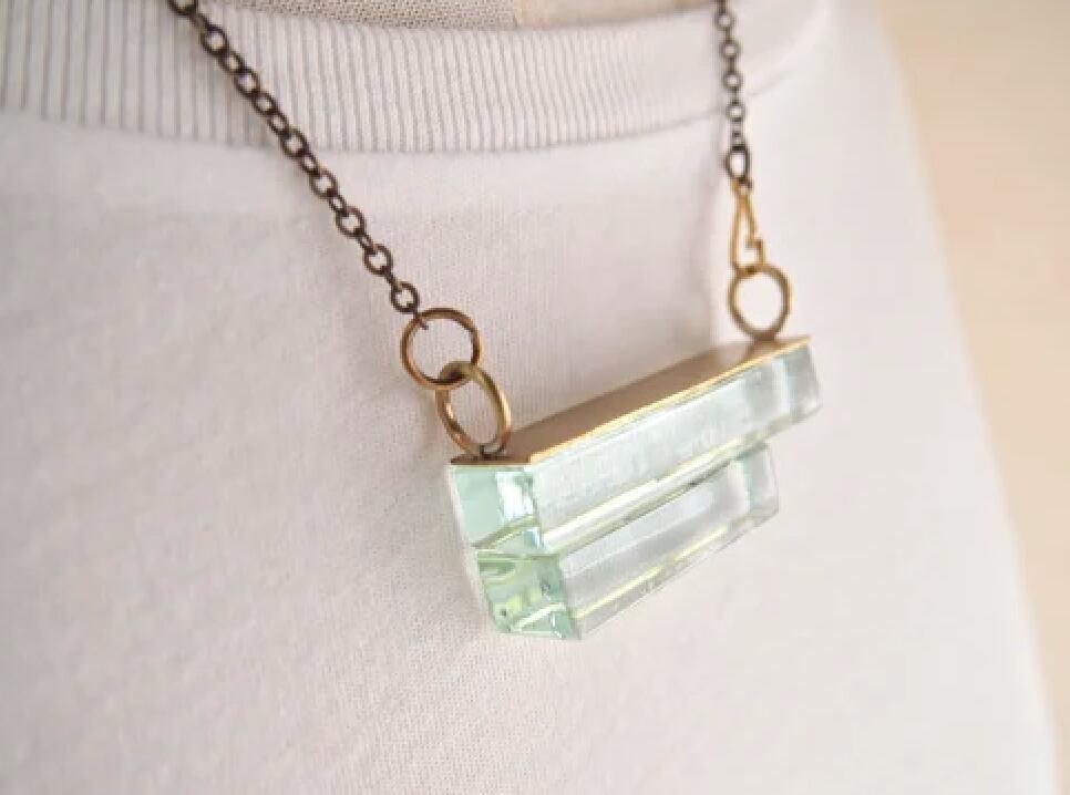 長方形にカットした淡い淡いブルーグリーンカラーのガラスを、アシンメトリーになるように重ねたネックレス。