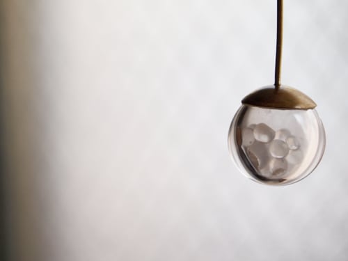 無色透明なガラスボールの中に小さなガラスのボールを閉じ込めた、なんともユニークなネックレスです。